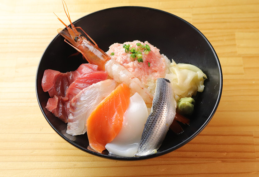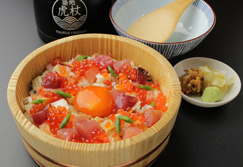 8種の海鮮を楽しめる「築地海鮮ひつま飯」は、丼・バラちらし・出汁茶漬けと3通りで味わえる逸品。